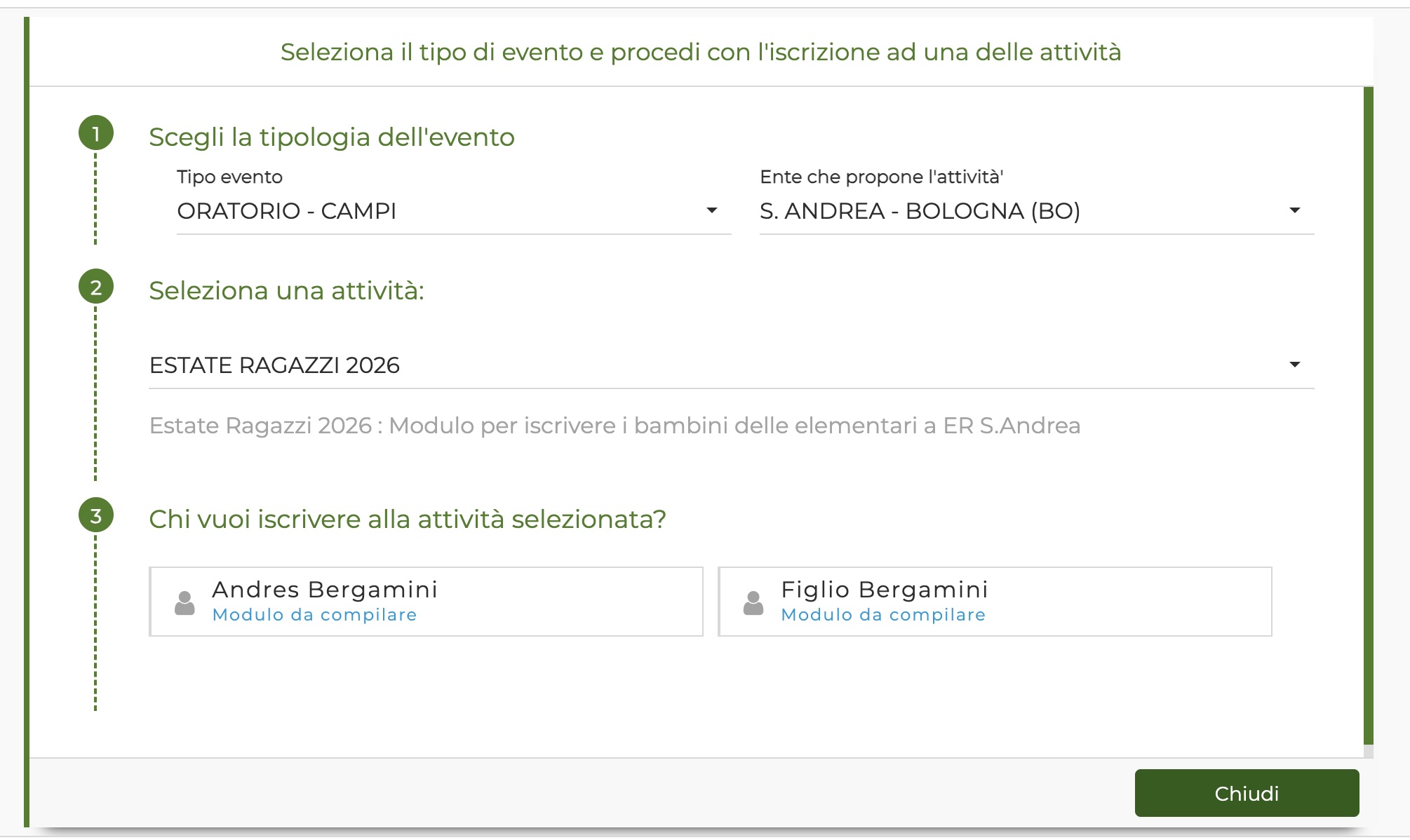 - Cliccare su “modulo da compilare” sotto il nome del minore a carico da iscrivereù